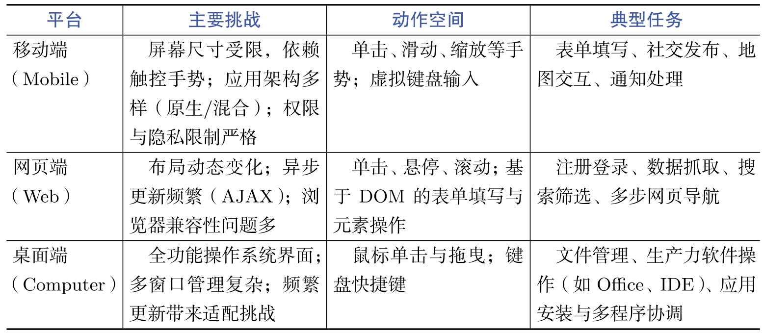 表4-1 不同平台下GUI智能体面临的主要挑战、动作空间与典型任务