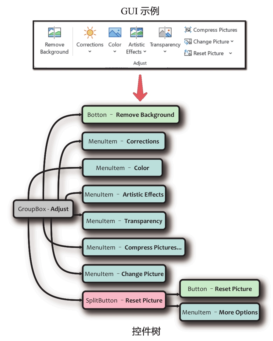 (2)控件树结构。 控件树(Widget Tree)提供界面元素的层次结构与属性描述 [118] ,例如元素的类别(Button、TextBox)、标签、状态(Enabled、Disabled)与空间关系(详见图4-4)。智能体可以通过Windows UIA、macOS Accessibility API、Android Accessibility API、HTML DOM等接口提取控件树,用于构建逻辑交互图(Logical Interaction Graph)。