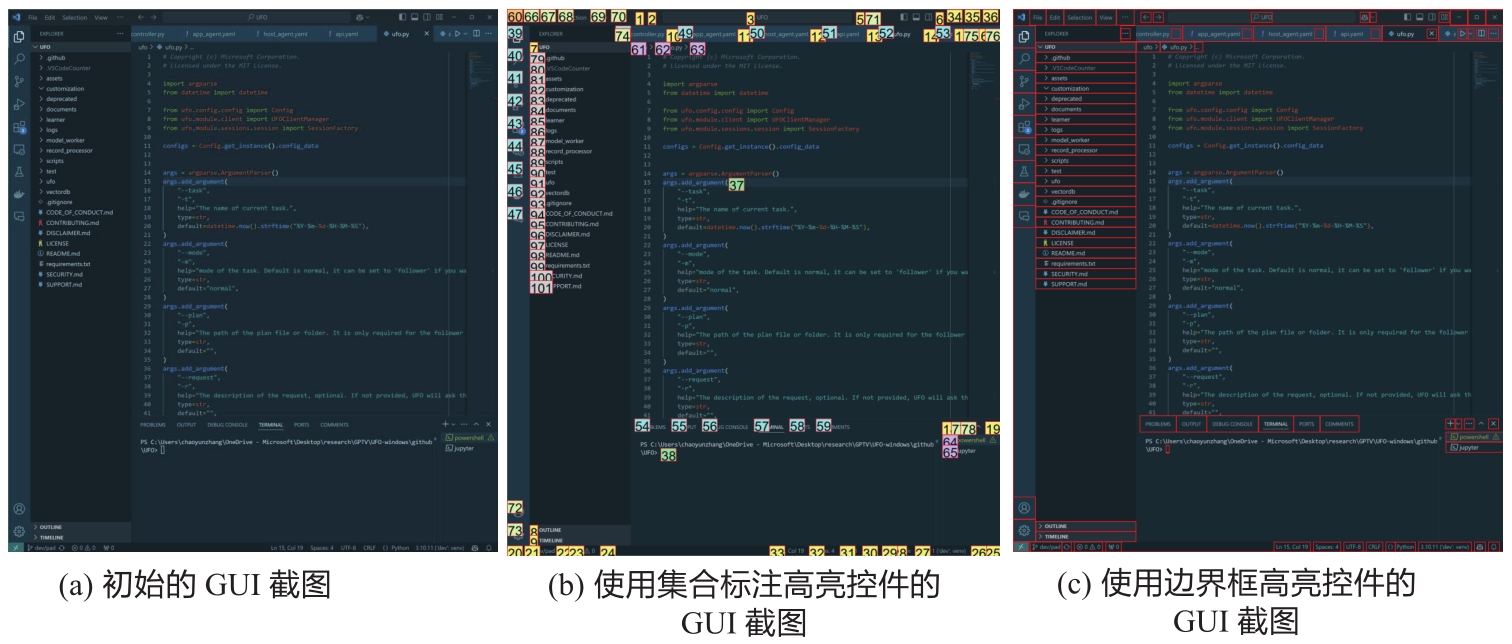 (1)屏幕截图。 通过截取应用界面的全貌,能够完整保留布局结构、图标分布和提示信息等视觉要素,为后续的图像理解与操作决策提供直观的依据。为了帮助模型快速聚焦关键控件区域并提高视觉推理效率,常见的做法是对原始截图进行标注。一方面,可以采用集合标注(Set-of-Mark,SoM) [116] 的方法,在控件群组附近添加色块或轮廓,突出其整体边界与内部联系;另一方面,也可以利用坐标框(Bounding Box) [117] 技术,为每个控件绘制精确的矩形框,明确其位置和大小。图4-3给出了VS Code界面在不同标注方式下的对比示例。在图4-3(a)中,可以直观地看到编辑区域、文件树和工具栏等模块的原始视觉信息;在图4-3(b)中,集合标注通过不同颜色的半透明色块将相关控件群组圈定,既保持了界面整体的连贯性,又为模型提供了“按组识别”的先验;而在图4-3(c)中,红色边界框精确框出了按钮、下拉菜单和文本输入框等单个元素,使模型能以更细粒度的方式捕捉空间位置和尺寸特征。结合这两类信息,智能体可以在视觉推理和动作执行上获得更高的准确率和稳健性。