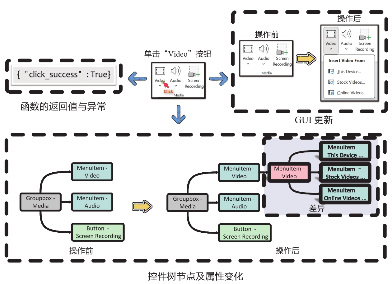 (2)控件树增量。 比对动作前后的控件树节点及属性变化,捕捉界面状态迁移,如弹窗出现、菜单展开和输入字段变化 [123] 。