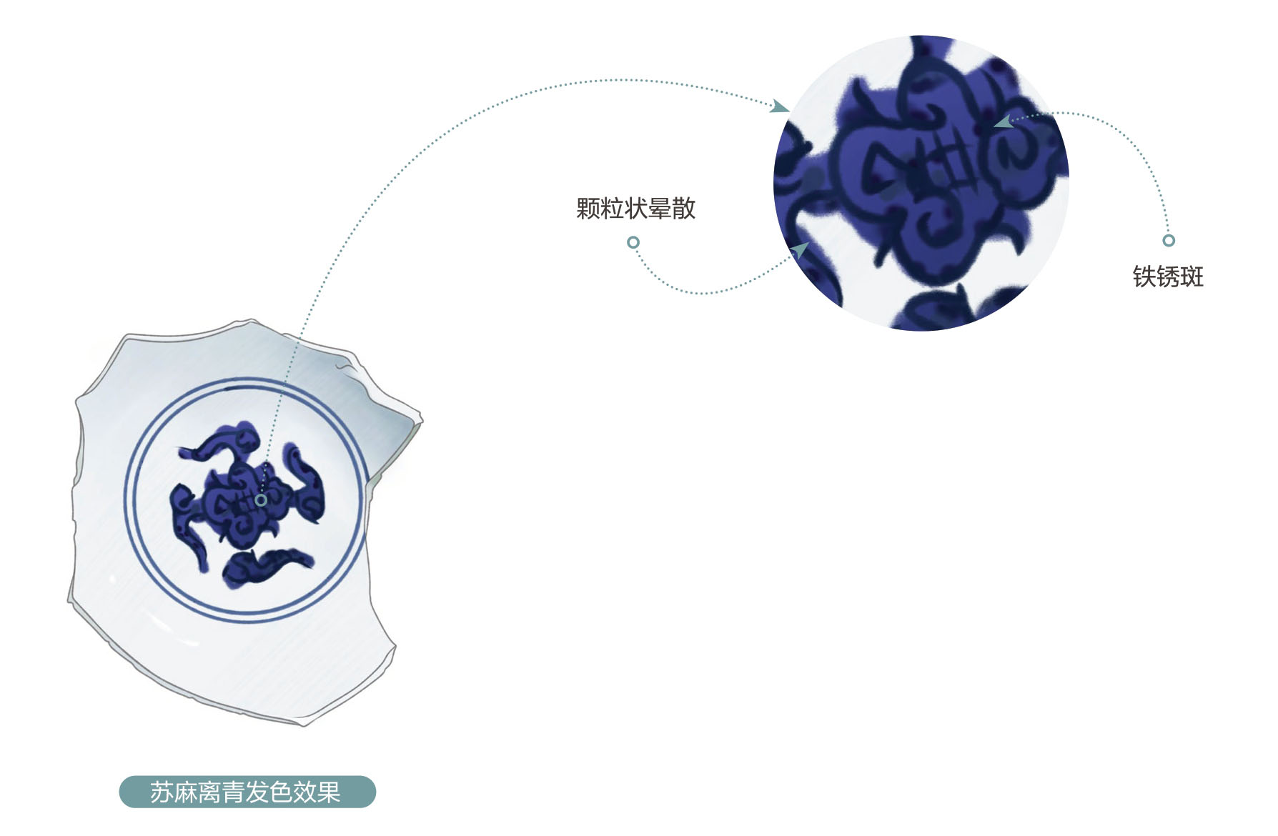 苏麻离青又称苏麻泥青、苏勃泥青、苏泥勃青等,简称苏料,是一种进口青料,产自波斯,用于青花瓷器的绘制。苏麻离青在元代中晚期便开始引进,至明洪武、永乐、宣德、正统、景泰、天顺时期均有使用。其呈色浓重而蓝艳,蓝中带紫,边缘多呈颗粒状晕散,具有中国传统水墨画中焦墨技法的奇特效果;色浓处多有铁锈斑,这种斑点呈浓黑的松烟墨色,吃胎严重,在铁锈斑处用手抚摸或迎光可见釉面呈凹凸不平状,俗称“坠釉入胎”。使用苏麻离青绘制的青花会呈现出蓝宝石般的鲜艳色泽,熠熠发光,极具观赏价值。