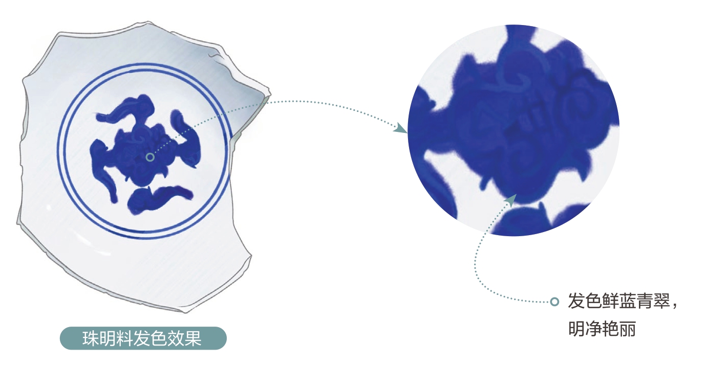 珠明料是一种国产青料,主要产自云南、江西和福建等省,其中以云南宣威所产珠明料含钴量最高。主要使用于明末至清早期。康熙时期著名的宝石蓝、翠毛蓝等色调,便是使用珠明料绘制而成,其发色鲜蓝青翠,明净艳丽,层次分明。