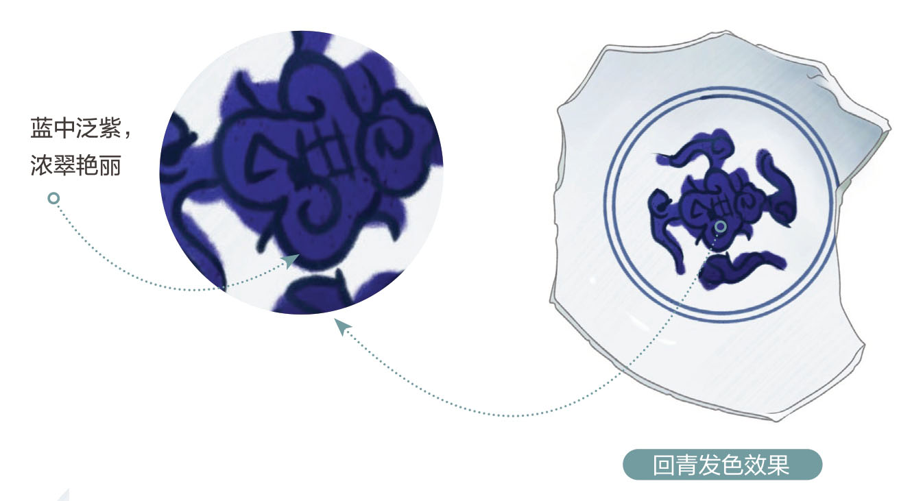 回青又称回鹘(hú)大青,全称为回回青,是一种进口青料,产自西域。回青料一般与国产料石子青配合使用,两种青料的配比较为讲究:若回青多,则散而不收;若石子青多,则色泽沉闷。配比上佳的回青料蓝中泛紫,浓翠艳丽。顶级的回青也被称为“佛头青”,异常珍贵,在某一时期,价格甚至超过了黄金。