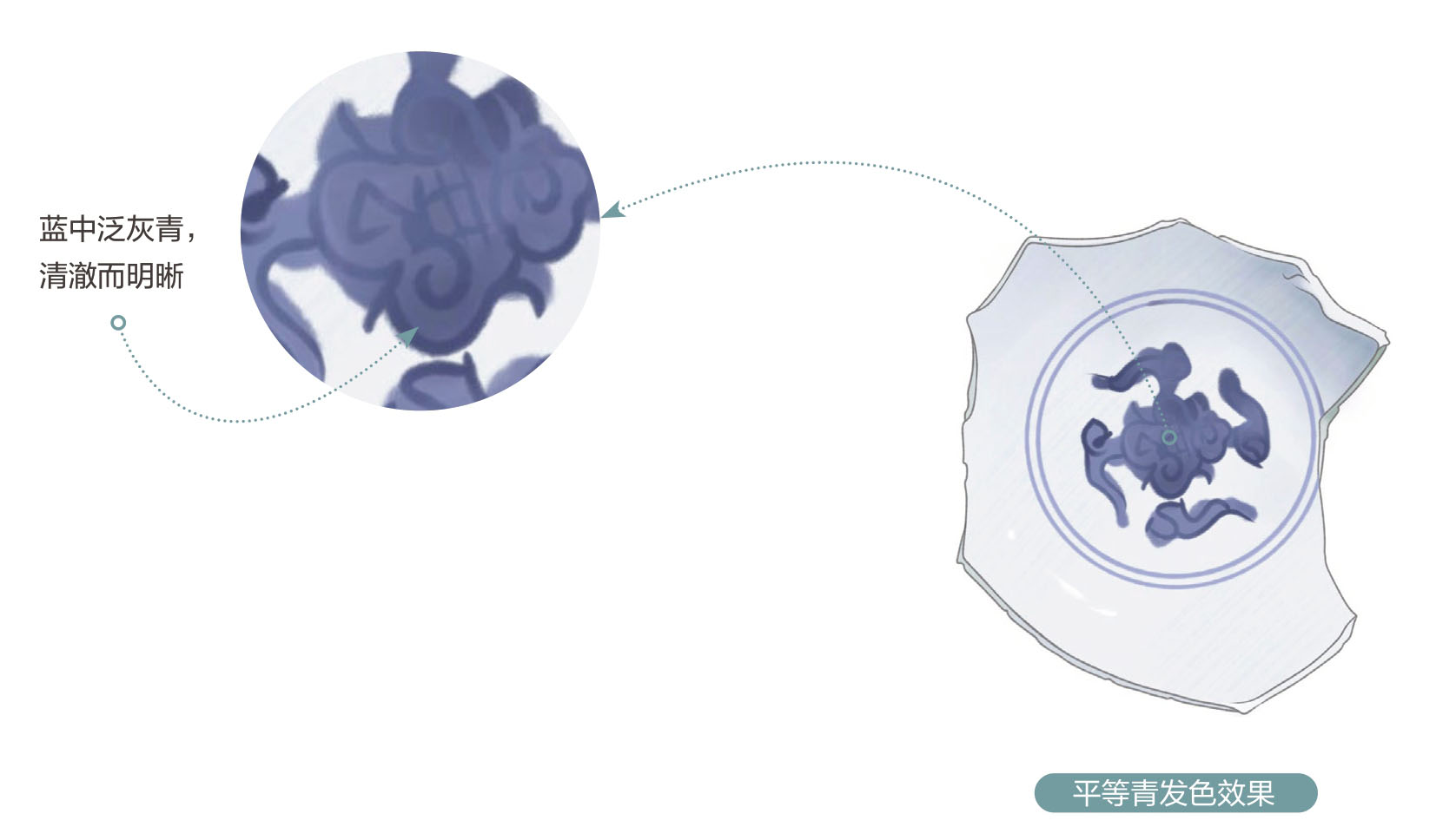 平等青又名“陂塘青”,是一种国产青料,产自江西乐平,用于青花瓷器的绘制,这种色料是在进口的苏麻离青色料用完之后开始被使用的。在明代中期景德镇窑的青花瓷制作中较为常用,呈色淡雅清亮,蓝中泛灰青,整体清澈而明晰,非常具有时代特色。