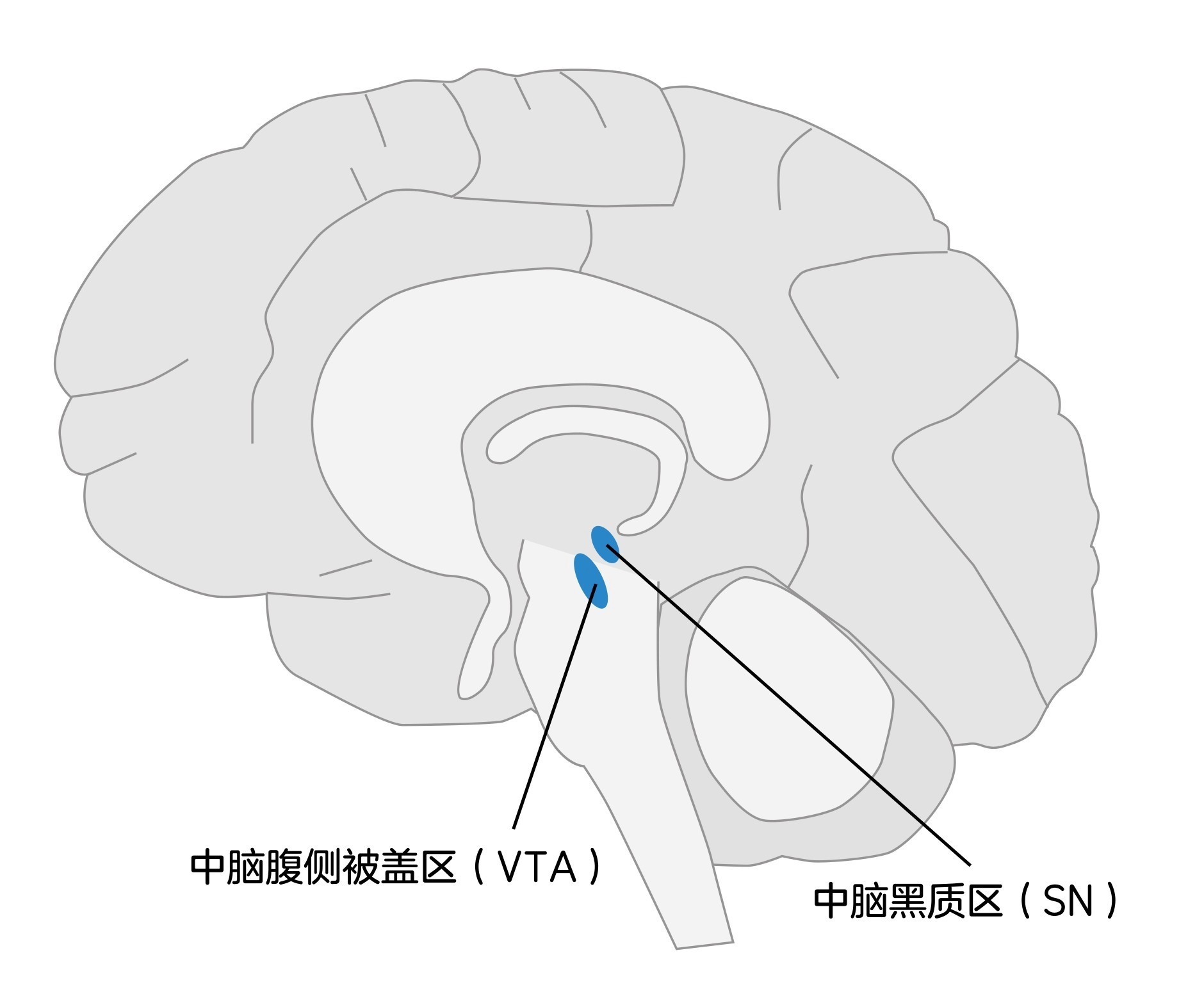 人类大脑中大约只有二十万分之一的脑细胞,会分泌多巴胺及与它相关的一些化学物质,包括内啡肽、催产素、血清素等,它们共同构成多巴胺能系统中最重要的化学物质。这些脑细胞集中在中脑黑质区(Substantia nigra, SN)和中脑腹侧被盖区(Ventral tegmental area, VTA),这两个区域都是我们大脑内部的物理器官。这些物理器官分泌的化学物质,以及它们之间的化学反应,被称作 多巴胺能系统 ——正是这个系统对运动行为的调节作用促成了人类所谓的动机,进而引发复杂的感受、思考,甚至重大的决策。