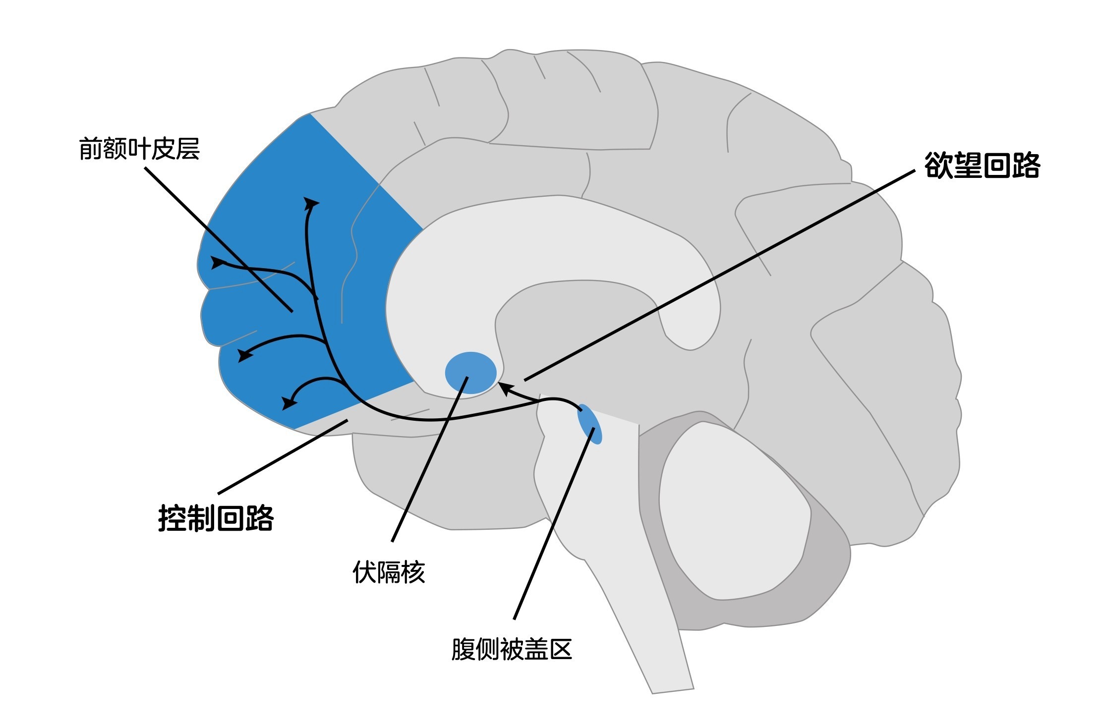 ●“控制回路”,即负责逻辑思维的回路,在“前额叶皮层”与“腹侧被盖区”之间。