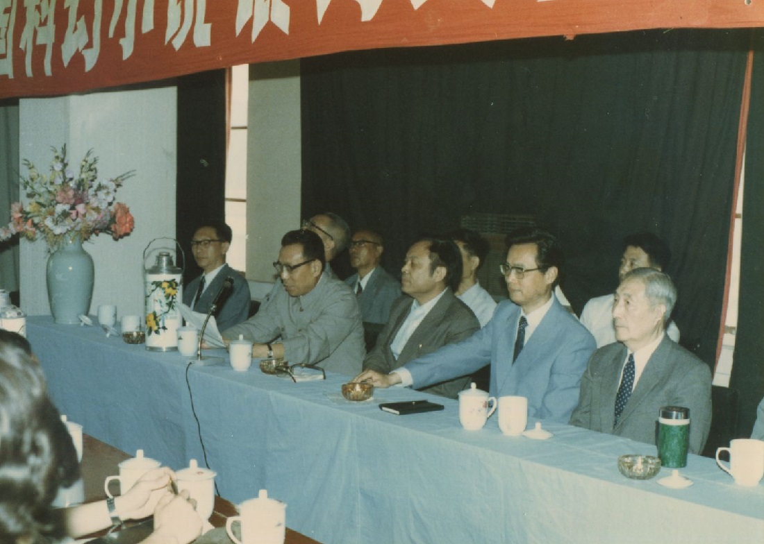 首届“中国科幻小说银河奖”发奖大会现场,主席台上(前排右起:童恩正、鲍昌、周玉振、李力众等;后排右起:王益奋、周梦璞)