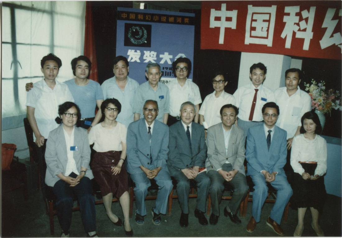 1986年5月,首届中国科幻银河奖颁奖大会后,获奖作者与颁奖领导以及《科学文艺》编辑们合影