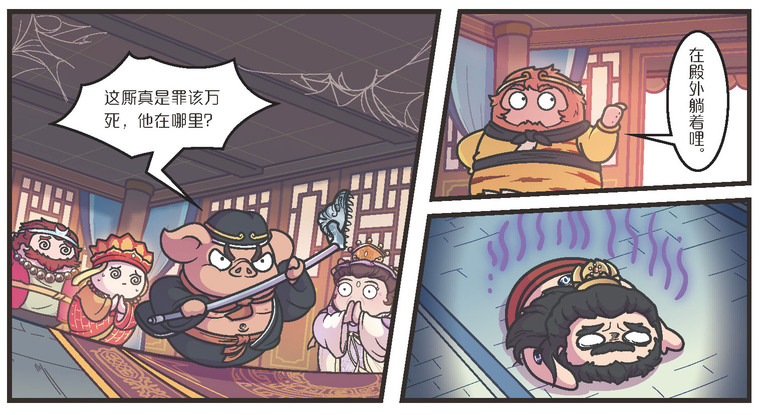 八戒走到殿外,拿耙便朝着道士打去,却被毗蓝婆菩萨拦住。
