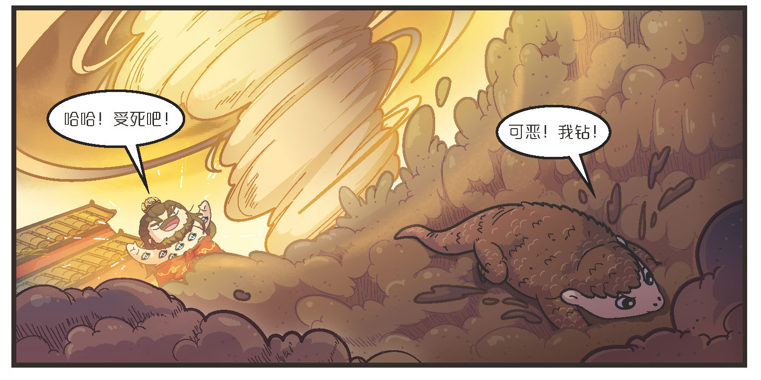 行者被困在这金光黄雾中,见从上方冲不出去,就念了个咒语,摇身一变,变成一只穿山甲,往地下一钻,钻了二十多里远,方才摆脱这金光黄雾。