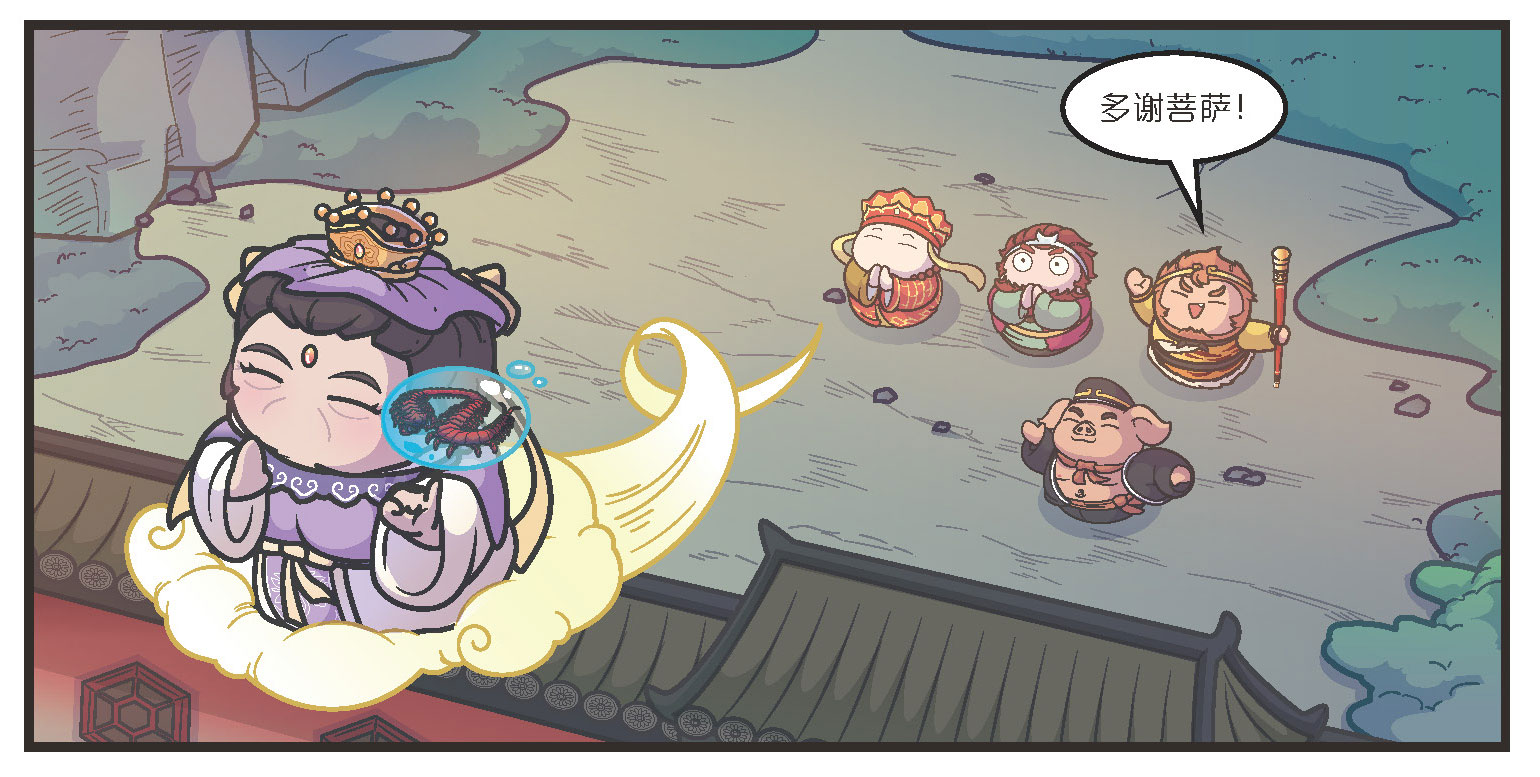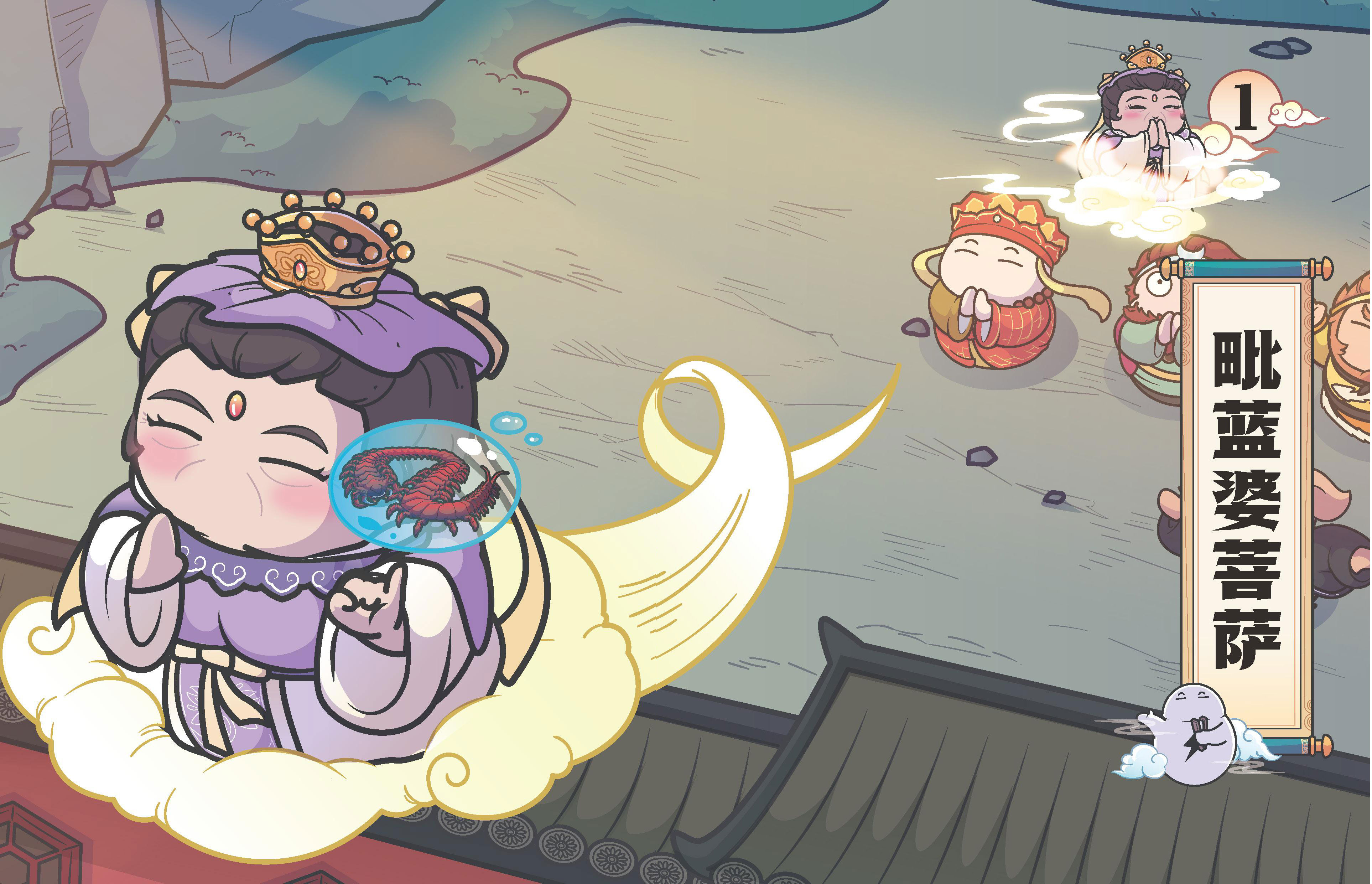 只见毗蓝婆菩萨用小指头挑起蜈蚣精,驾着祥云便回了千花洞。