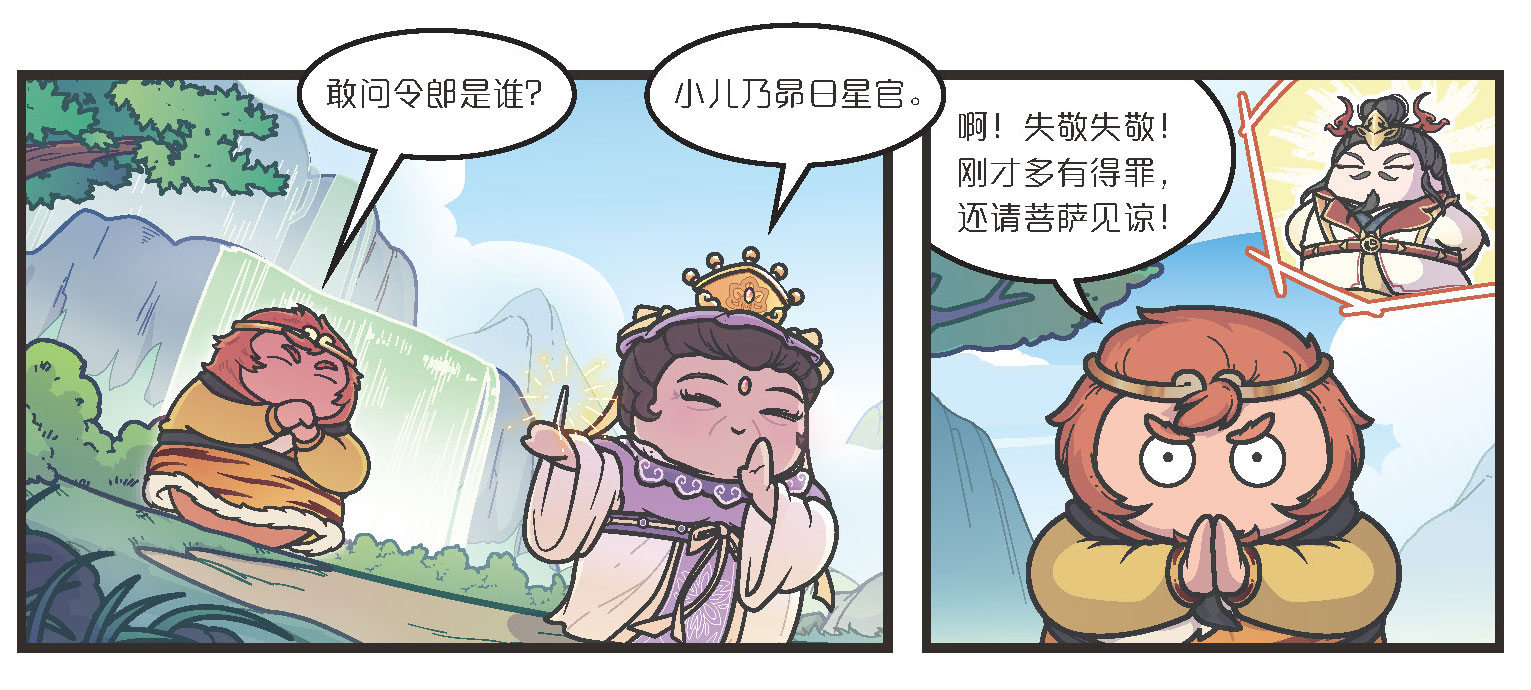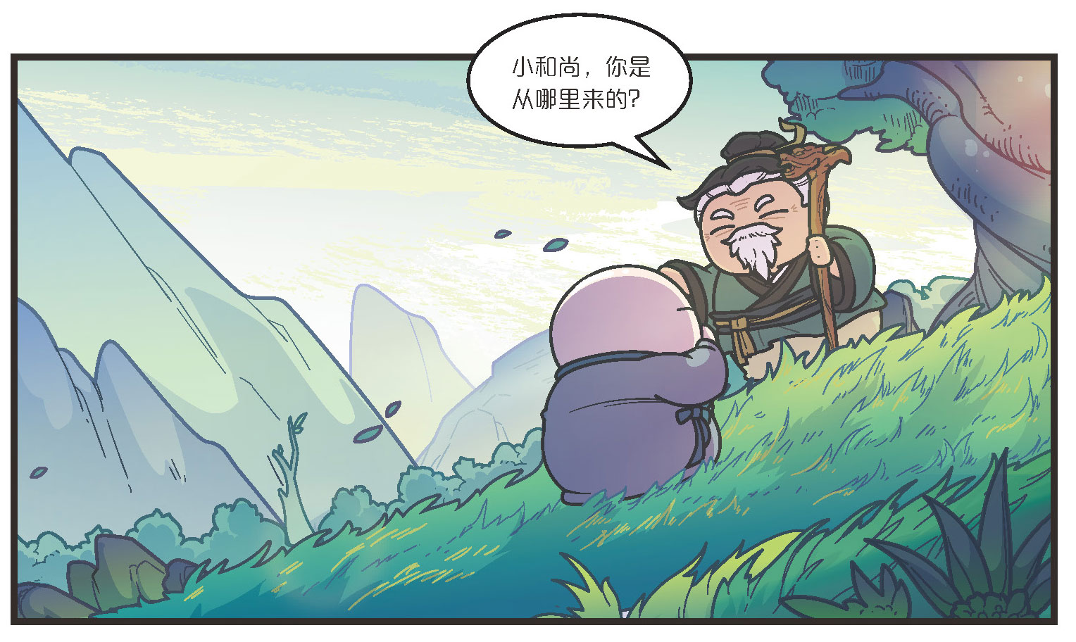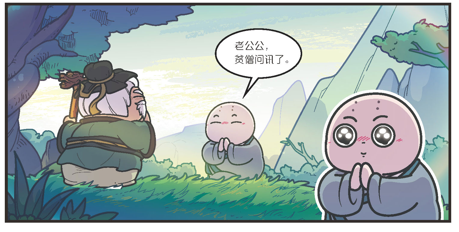 行者听后,念动口诀,摇身一变,变成一个干干净净的小和尚,他来到山坡对面,见到那个老人后,躬身行礼。