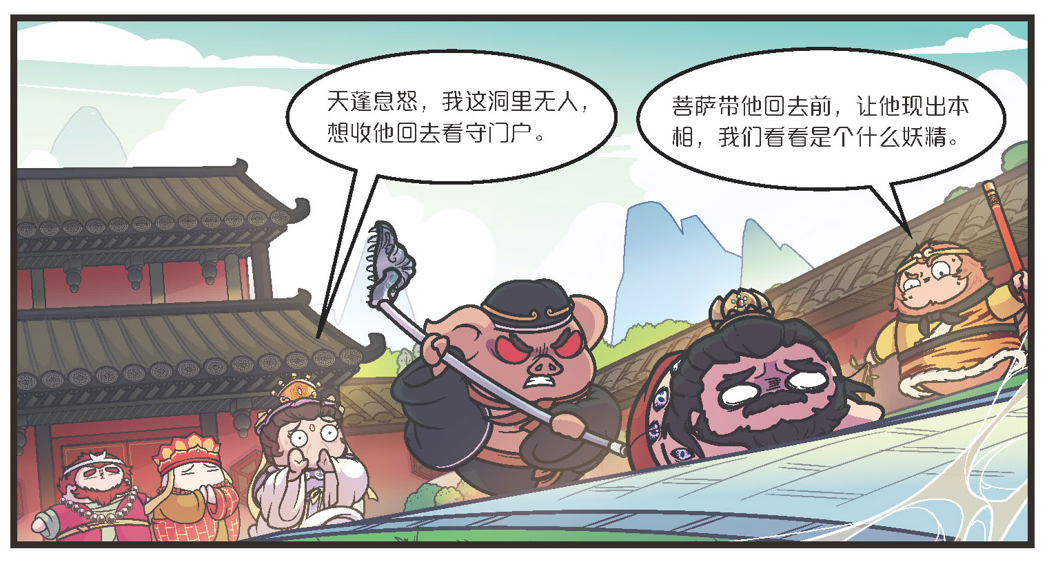 三藏理了理衣服,带着两个徒弟拜谢菩萨,行者将他们晕倒之后发生的事情,都说给了他们听。八戒得知后,发狠说道: