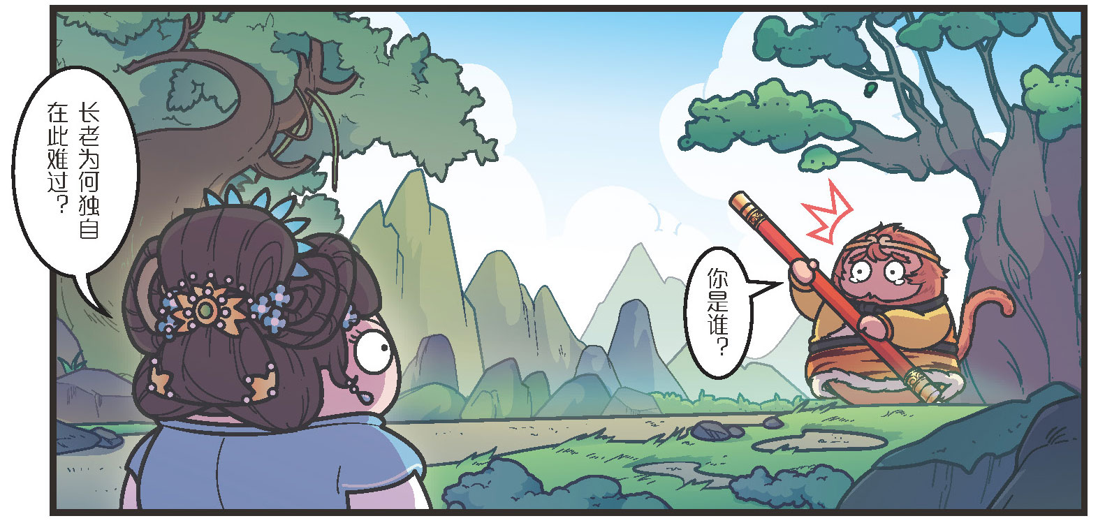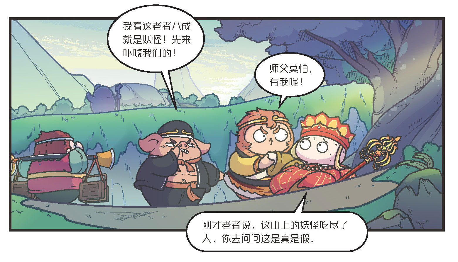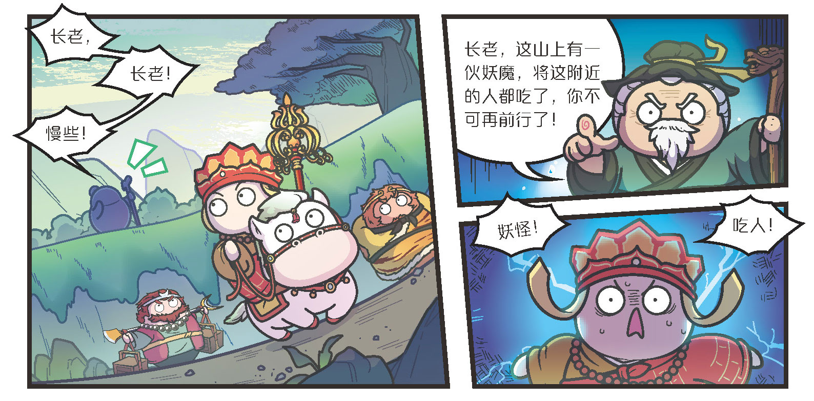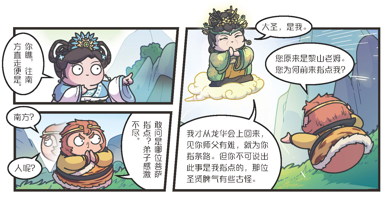 三藏策马前行,率先来到了山上。这时有一位满头白发的老人,他手拿龙头拐杖,远远地立在山坡上对三藏喊道: