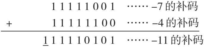 高位 1 丢弃(允许产生最高位的进位被丢弃),余下部分 11110101 按照例 1.18 补码求原码的方法进行,求得原码为 10001011,即为-11。