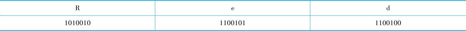 ①ASCII码字符编码表中的每个字符的二进制编码为 7 位,因此一共有 2 7 =128 种不同字符的编码。通常一个ASCIL码占用一个字节(即 8 bit),其最高位为“0”。例如,“Red”的ASCII码编码见表 2-3。