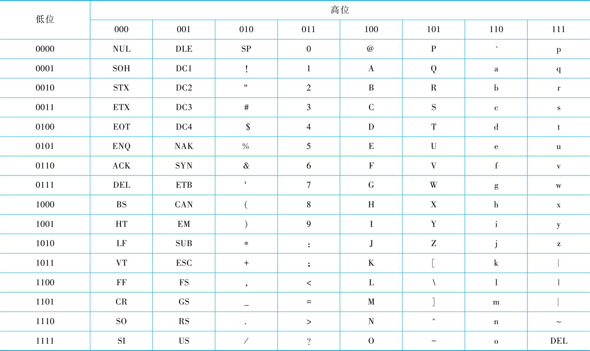 ASCII码最初只有 7 位。7 位ASCII码采用二进制数编码,包括 10 个十进制数码(0~9)、52 个大小写英文字母、33 个字符和运算符、33 种控制字符(如回车、删除等),一共 128个不同的符号。7 位ASCII码字符编码表见表 2-2。