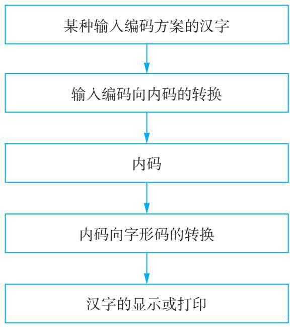 计算机中汉字的表示也是采用二进制编码。根据应用目的的不同,汉字编码分为外码、交换码、机内码和字形码等。汉字编码在计算机中的实现过程如图 2-3 所示。