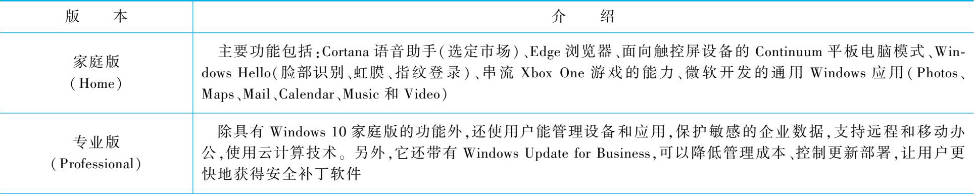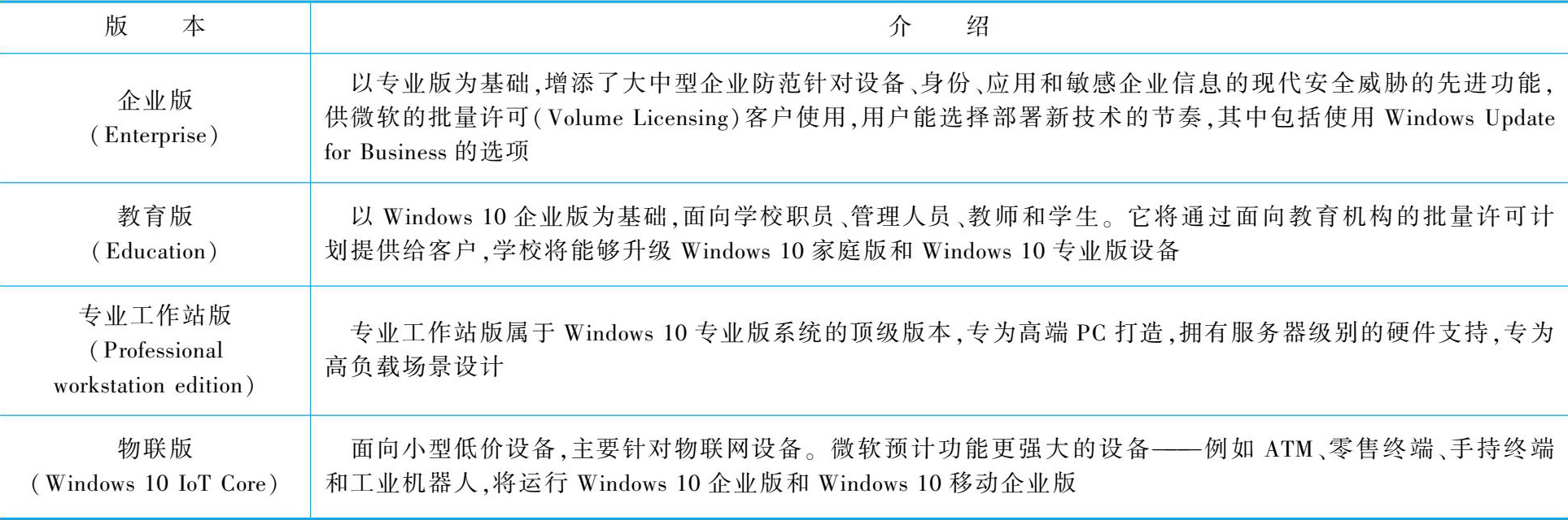 Windows 10 包括:家庭版(Windows 10 Home)、专业版(Windows 10 Professional)、企业版(Windows 10 Enterprise)、教育版(Windows 10 Education)、专业工作站版(Windows 10 Professional workstation edition)、物联版(Windows 10 IoT Core)等,见表 4-1。