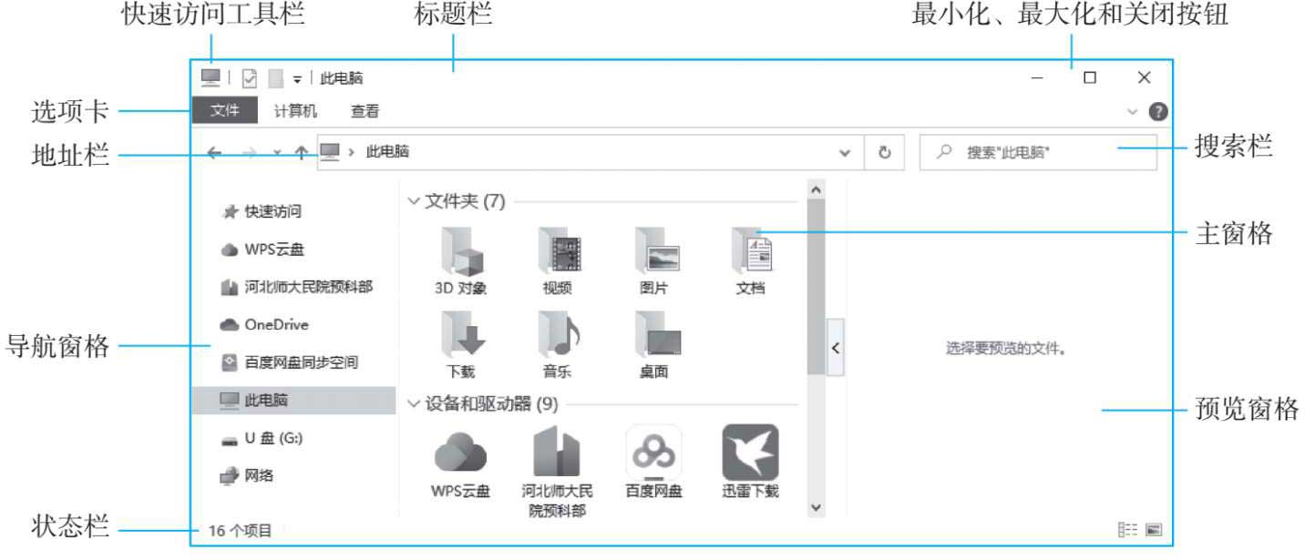 Windows 10 的窗口虽然内容各不相同,但具有很多共同点,通常都包括标题栏、选项卡、导航窗格、状态栏、最小化按钮、最大化/还原按钮和关闭按钮等。下面以图 4-11 所示的Windows 10 窗口为例来介绍窗口的主要组成部分。