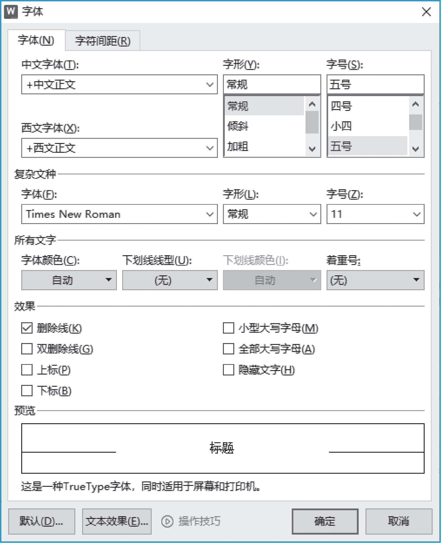 ④复选框:复选框是左侧带有一个方形的选项。与单选按钮不同的是,复选框可以在一组选项中选择一个或者多个项目,单击空的复选框即可选择该项目,被选中的项目方框内会显示“√”标记,比如“效果”选项组中的“删除线”复选框。
