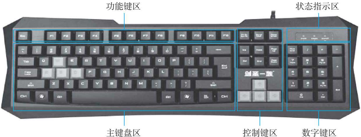 一般情况下,键盘可以分为五个区域:功能键区、主键盘区、控制键区、数字键区和状态指示区,如图 4-16所示。