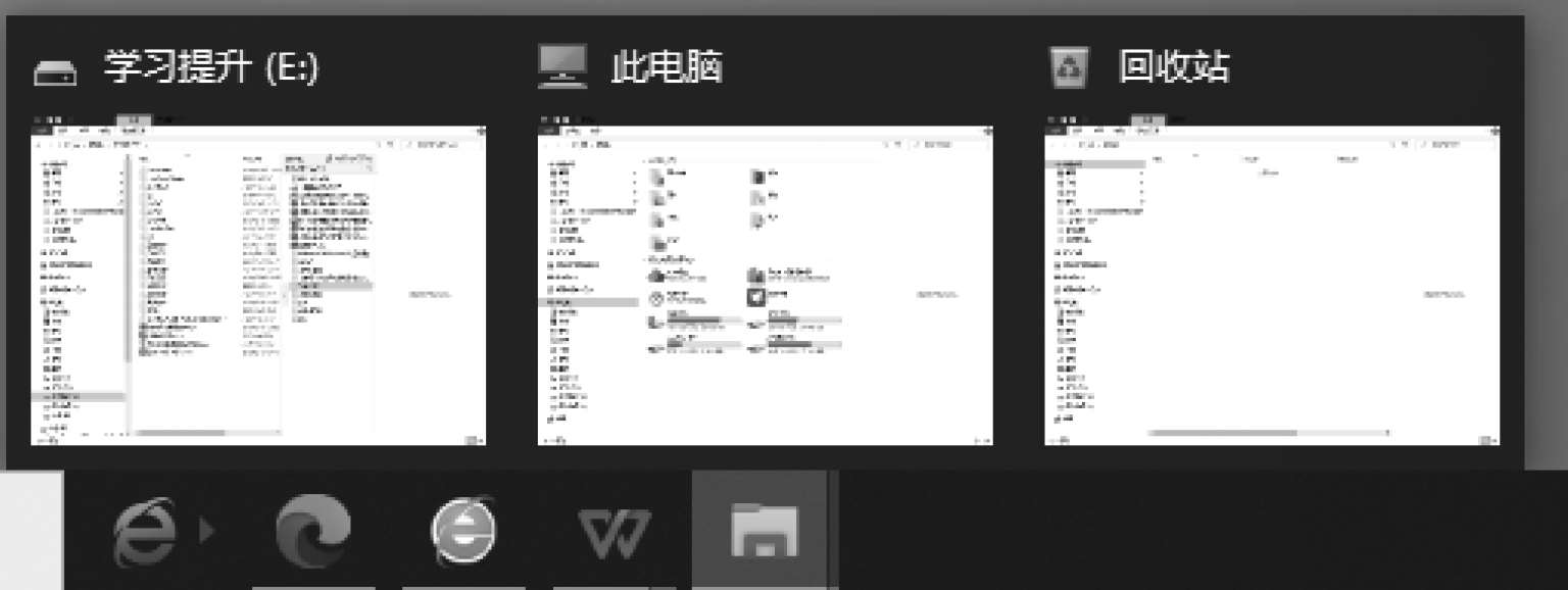 默认状态下,Windows 10 会将相同类型的活动任务按钮分组。例如,在打开了多个文件夹窗口时,只会在任务栏中显示一个活动任务按钮,只需将鼠标移动到任务栏上的活动任务按钮上稍作停留,就可以看到各个程序窗口的缩略图,单击相应窗口即可完成窗口切换,如图 4-6 所示。