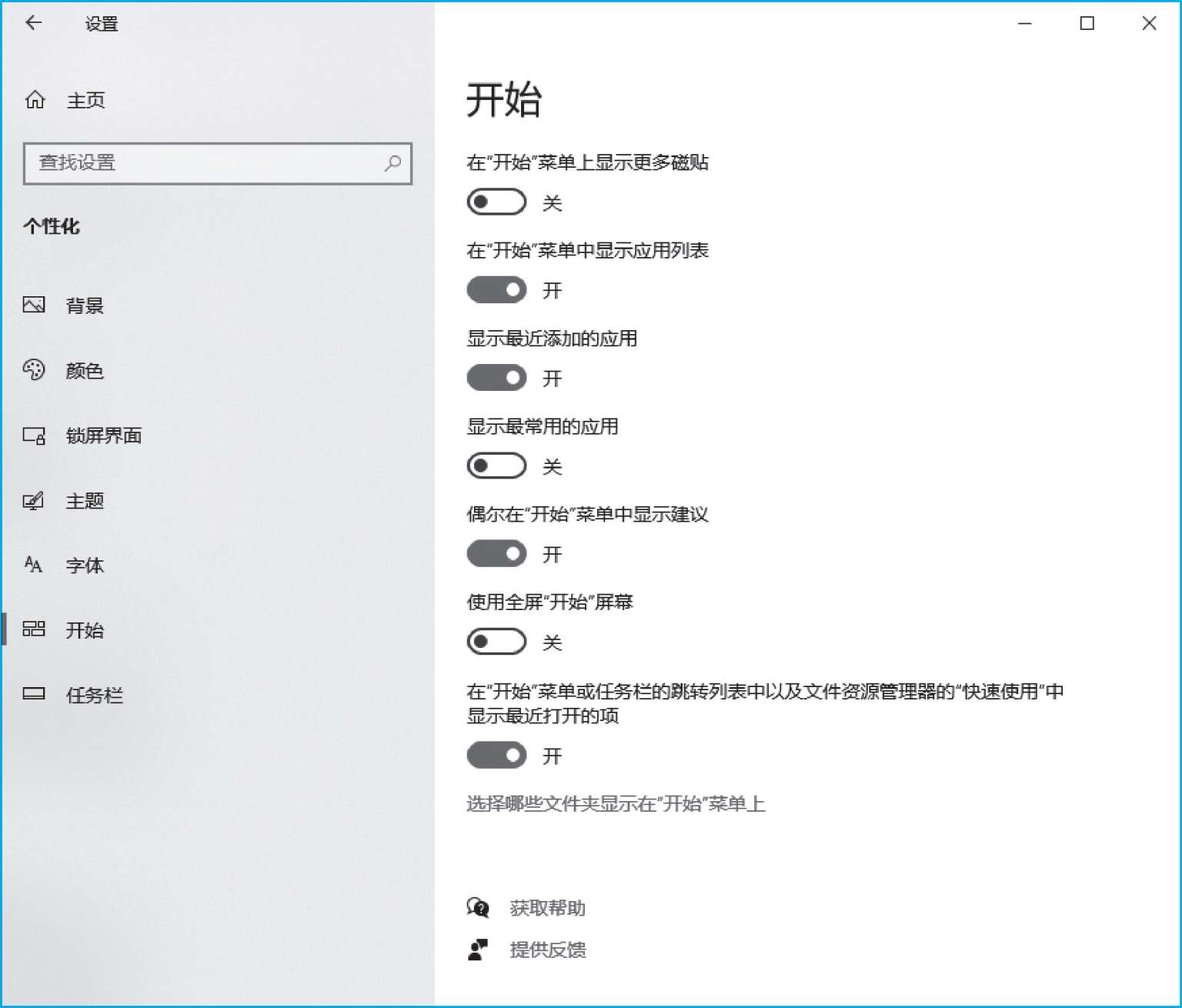 在Windows设置窗口中,单击“个性化”选项,弹出“个性化”设置窗口,如图 4-10 所示,通过开关按钮显示项目的设置。如果要设置显示的文件夹,在窗口中单击“选择哪些文件夹显示在‘开始’菜单上”命令,在打开的窗口中进行相应的选择即可。