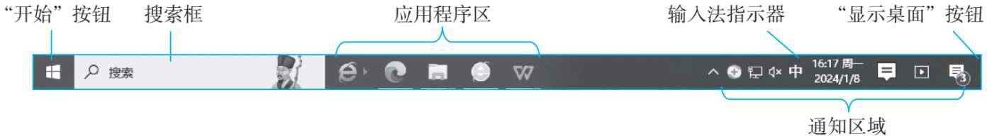 任务栏是指位于桌面底部的水平长条,显示正在运行的程序。任务栏的组成部分从左到右依次是“开始”按钮、搜索框、应用程序区、通知区域,如图 4-5 所示。