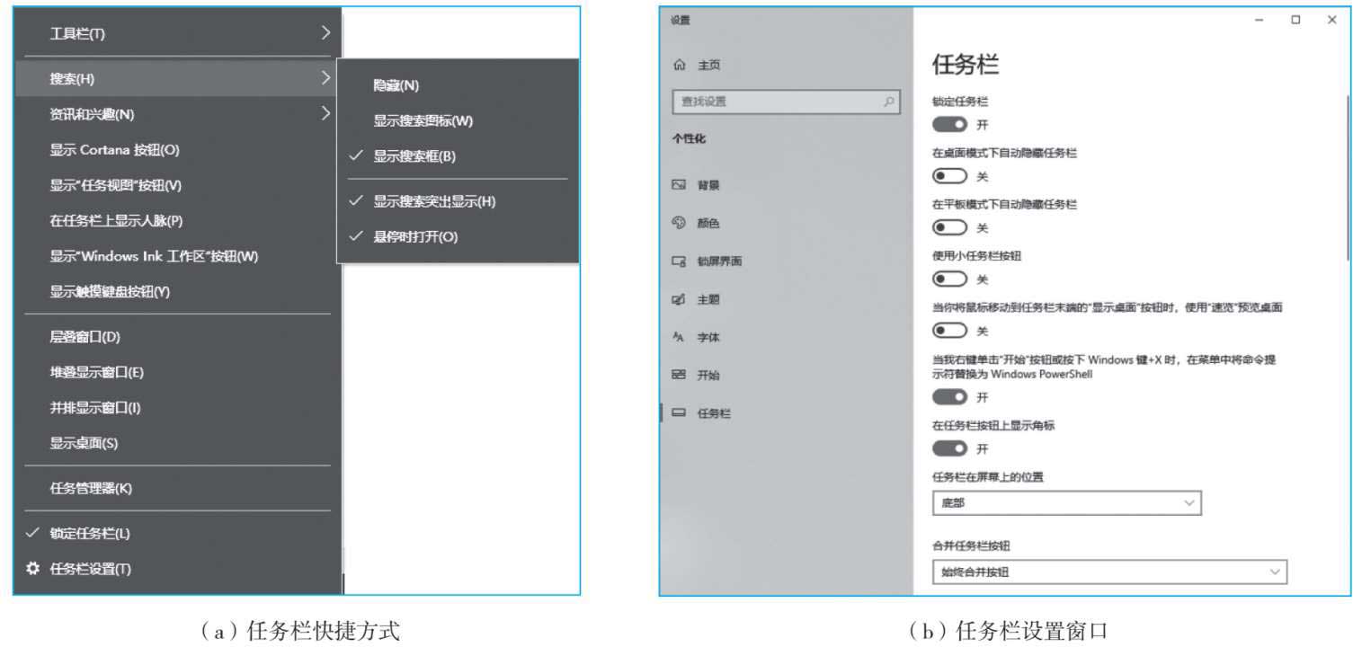 右击任务栏的空白位置,打开任务栏快捷菜单,如图 4-7(a)所示,从中选择“任务栏设置”命令,打开任务栏“设置”窗口,如图 4-7(b)所示,在任务栏“快捷菜单”和“设置”窗口可以进行相关的定制操作。其中主要包括的设置选项如下:
