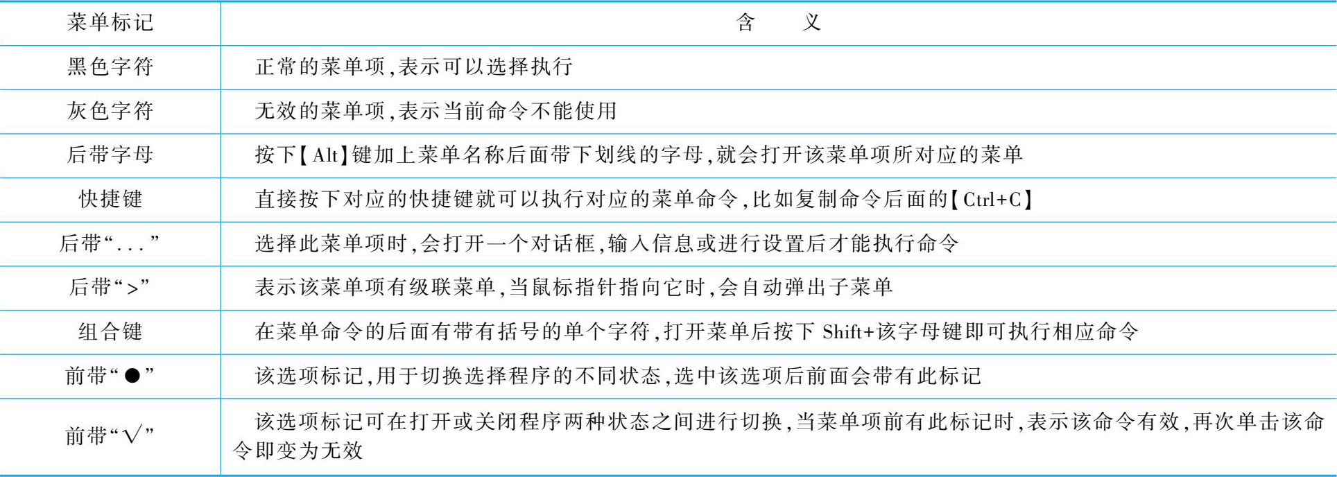 在Windows 10 中,为了方便用户操作时快速识别不同类型菜单的含义,系统在一些菜单项的前面和后面增加了一些预定的标记,不同标记所代表的含义见表 4-2。