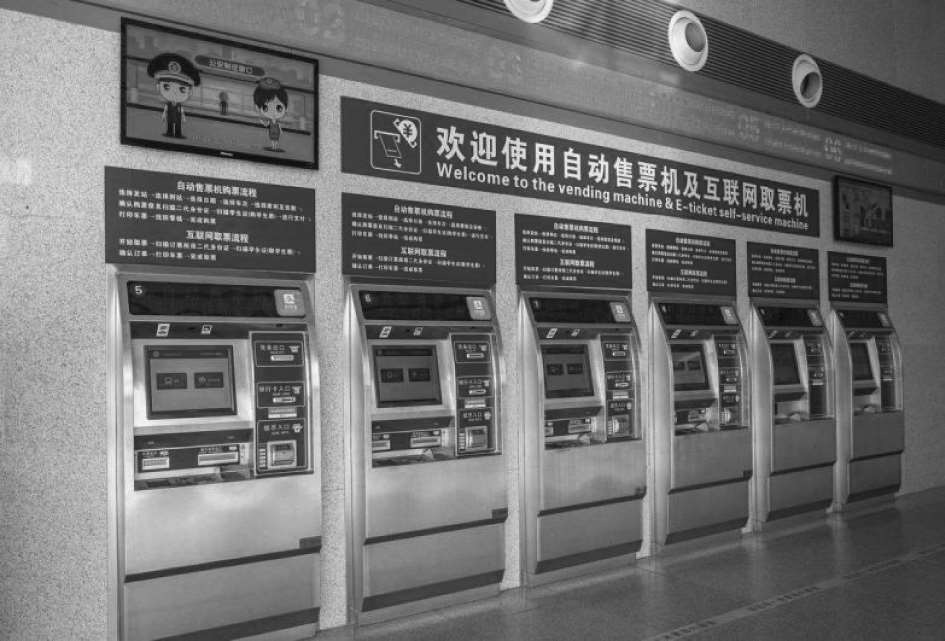 票务服务是高速铁路客运的核心服务内容,也是对高速铁路位移服务产品实现市场交易的重要环节。随着信息技术的不断发展,票务服务又分为互联网票务服务、电话票务服务、车站窗口及代售点票务服务、自助票务服务。现阶段,高速铁路车站中涉及的票务服务主要是车站窗口票务服务和自助票务服务(图3.5及图3.6)。车站人工售票窗口可提供售票、退改签、余票查询、换取报销凭证(纸质车票)、打印“行程信息提示”凭条、电话订票支付票款、进/出站补票、挂失补退票、大屏余票显示等服务。
