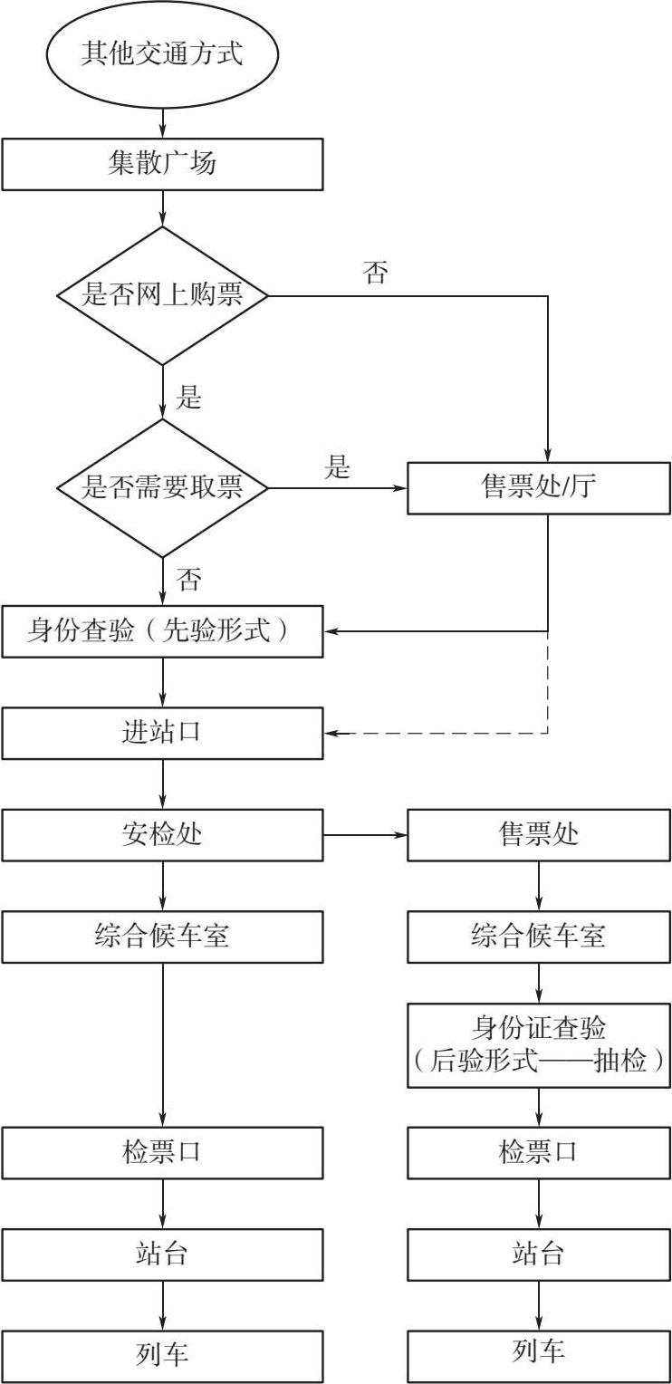 相对来讲,高速铁路车站的进站服务流程、服务内容及环节较出站复杂,本书重点分析进站服务及相关设备。高速铁路车站进站服务包括:票务服务、安检服务、验证验票服务、候车服务、检票服务、站台候车服务、通道服务、其他辅助服务。
