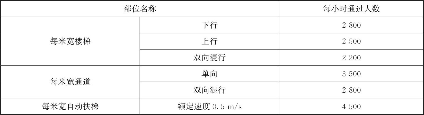 除自动扶梯外,站内常见的通行设施还包括楼梯等。通过现场数据采集和客流模拟软件分析,当前铁路客站各主要通行设施高峰通行能力通常见表3.5。