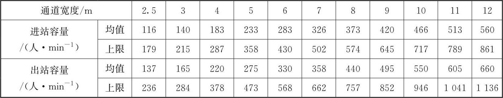 根据对贵阳、成都、西安、南昌、长沙、北京等站的天桥、地道进行实地调查发现,进出站及地区间通道的旅客行走速度、单股步行道的宽度及每位旅客占用通道的前后间距差别不是很大,可以用一个数值范围及均值概括,参考数值见表3.6。