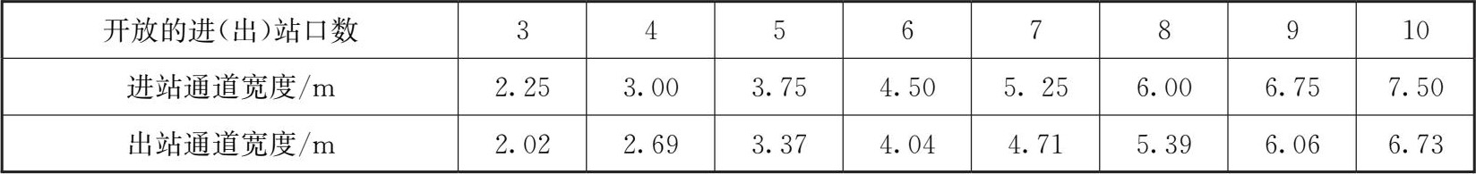 由表3.8可知,旅客进站时,需开放的进站口数量取决于进站通道的宽度,通道不足时,以进站检票口为控制点,使客流不超过通道的通行容量。旅客出站时,需开放的出站口数量也取决于通道宽度。由于旅客下车后直接进入通道,若开口数量不足,就会产生客流积压,因此,旅客在出站时,通道成为控制点,要求开放出站口个数与之适应。根据《铁路车站及枢纽设计规范》,旅客进出站通道的最小宽度应符合表3.9的规定。