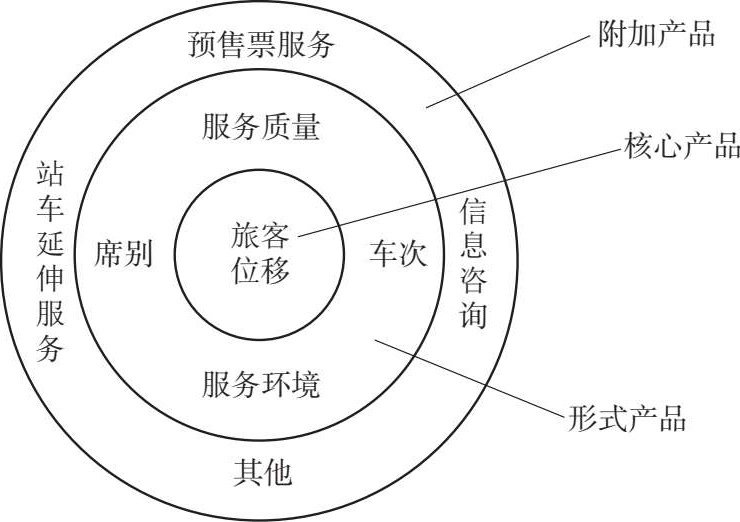 高速铁路客运产品是铁路运输企业提供的满足客户位移需求的某种价值或利益的组合,包括核心产品、形式产品和附加产品三个层次,企业通常按一个整体提供给客户,如图1.2所示。