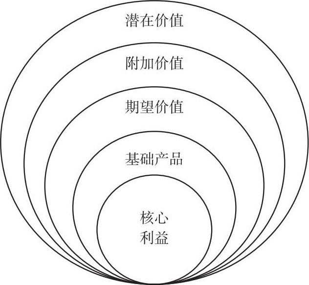 借助菲利普·科特勒服务层次划分理论,从客户服务体验和感知角度可以确定高速铁路客运服务的五个层次,即核心利益、基础产品、期望价值、附加价值和潜在价值,如图1.1所示。