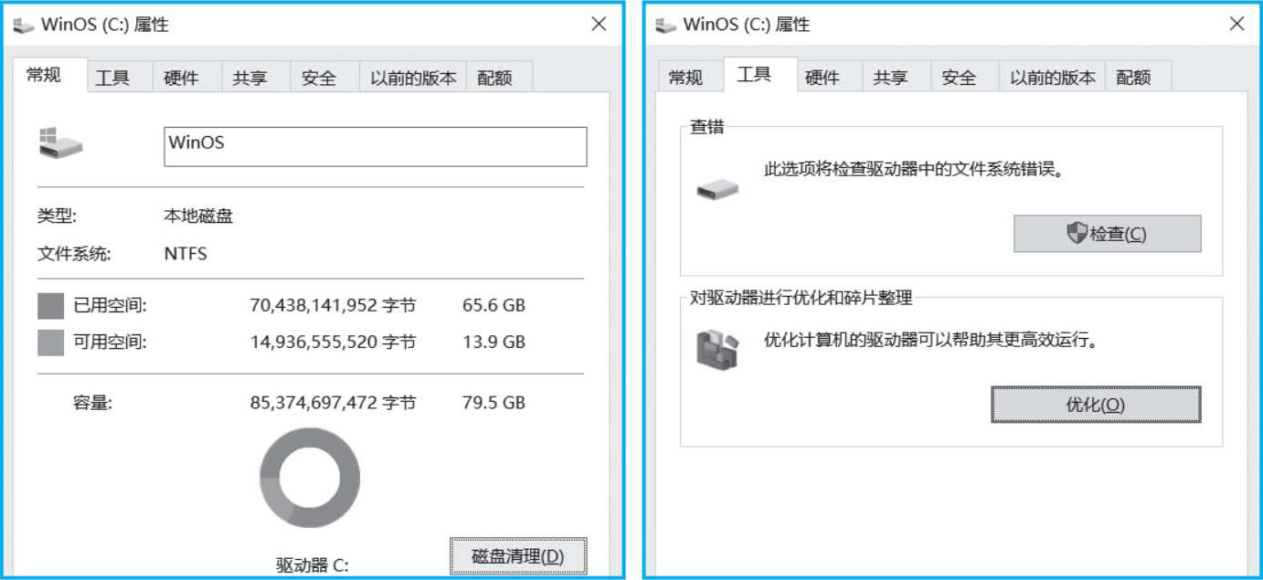 磁盘优化管理分为两种:一种是磁盘清理,另一种是进行磁盘碎片整理。计算机在使用一段时间后,由于频繁的读写操作,磁盘上会残留许多临时文件或安装文件等无用的文件,为了释放硬盘空间,就需要进行磁盘清理。另一方面,随着文件不断创建与删除,硬盘空闲空间会逐渐碎片化,后面存入的文件将被分散存储,引起文件读写速度的降低。通过磁盘碎片整理,就可将文件碎片重新组合到连续空间上存放,以改善磁盘读写效率。