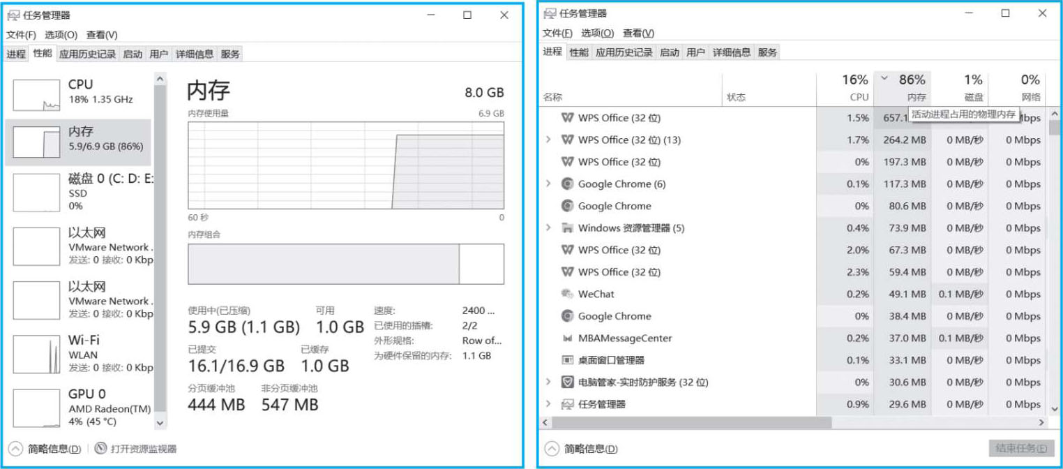 了解正在运行的程序占用内存的情况可以采用下面的快捷方法:右击任务栏空白位置,从快捷菜单中选择“任务管理器”选项,打开“任务管理器”窗口,选择“性能”选项卡,可查看当前系统消耗的总内存比例,如图1-28所示。进一步单击“进程”选项卡,可根据内存占用的大小对正在运行的进程排序。图1-28显示了编著者正在使用的计算机中,WPS Office消耗的内存资源最多,而且不止一个进程,仅显示出来的WPS各进程的内存消耗超过1 GB。