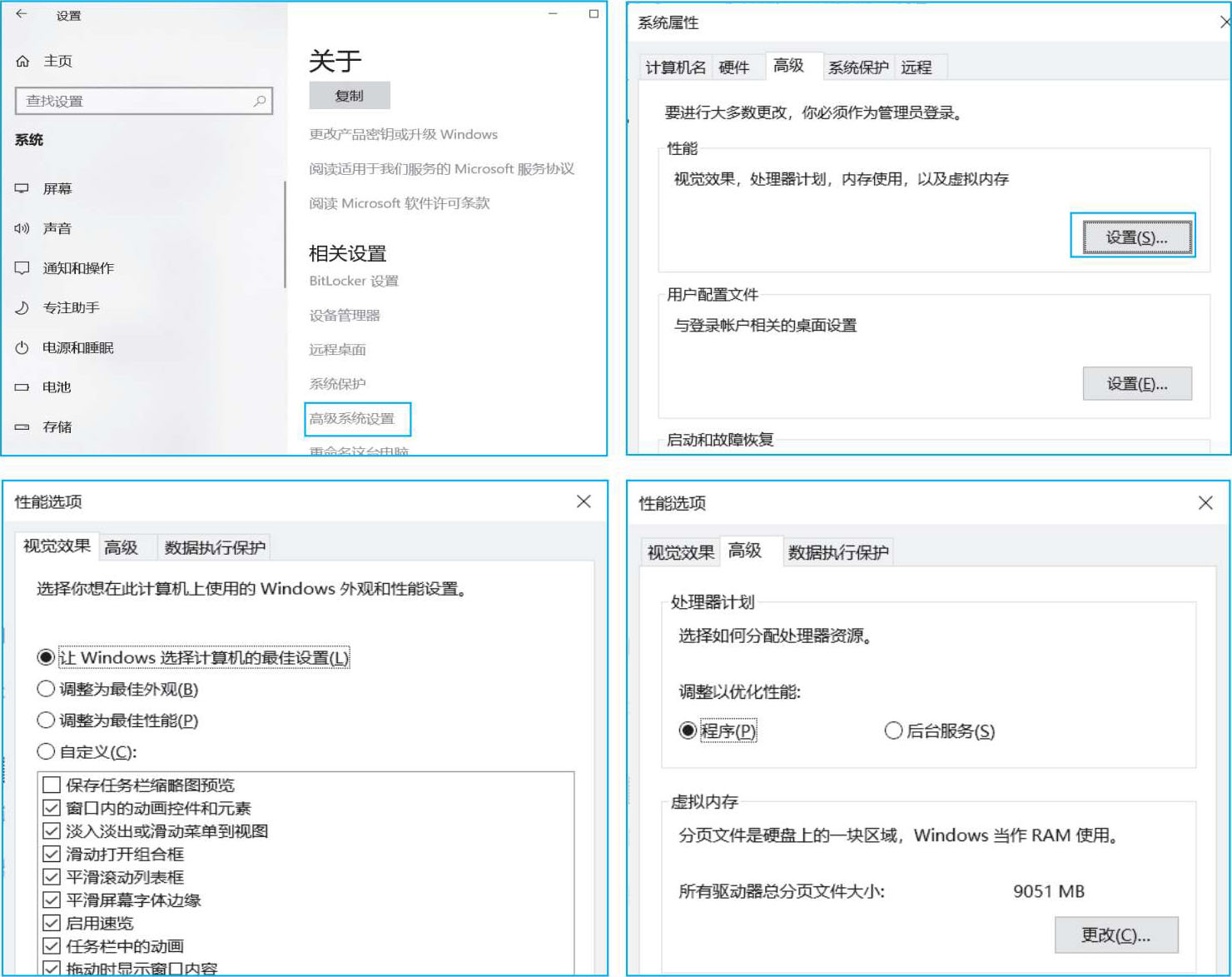 如图1-27所示,通过控制面板打开“系统”窗口后,在“系统”窗口左侧单击“关于”项目后,在右边“相关设置”子类中,单击“高级系统设置”项打开“系统属性”窗口,进一步单击“高级”选项卡,单击“性能”组合框中的“设置”按钮,在弹出的“性能选项”对话框中选择“视觉效果”选项卡,可以选择“调整为最佳性能”或“调整为最佳外观”单选按钮。可以通过对比两个选项的显示效果,来体会它们之间的差异。在“性能选项”对话框“高级”选项卡中还可以调整处理器优先策略和虚拟内存的大小及位置。