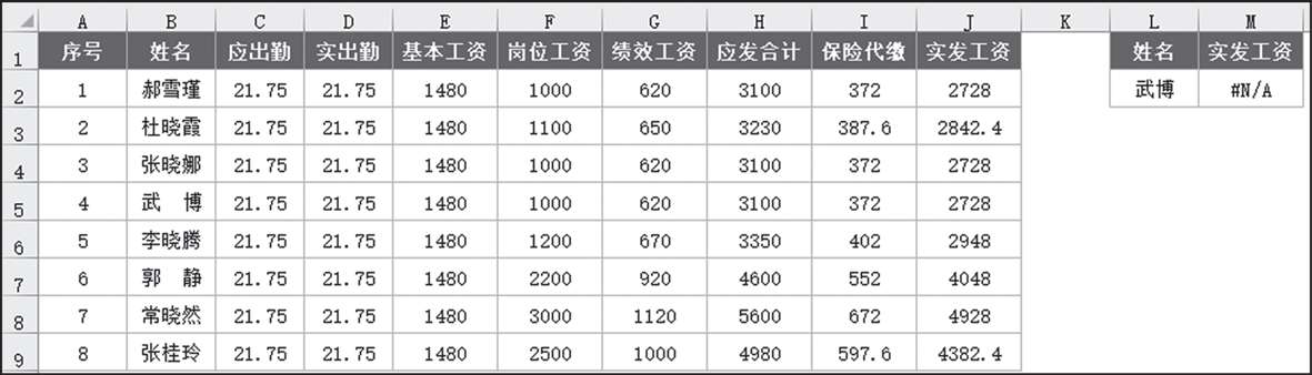 图 2-19 所示为要查找“武博”的实发工资,在M 2 单元格中输入公式“=VLOOKUP(L2,$B$2:$J$9,9,0)”,返回的结果为错误值#N/A。