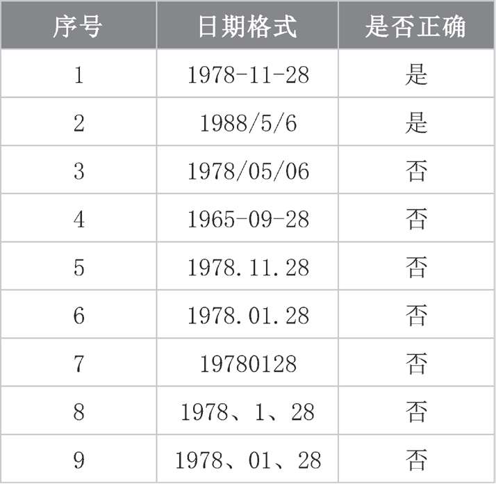 在Excel表格中出现不规范的日期格式,无论是筛选、排序、数据透视表还是公式计算等,都会出现错误的信息,必须将这些不规范的格式规范后才能参与统计运算。图2-20所示为常见的正确和错误的日期格式。