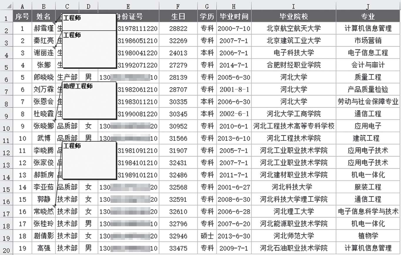 如图2-24所示,在设计人事信息表时,没有考虑统计员工技术职称这一项,统计时为了不破坏原来的表格结构,在姓名单元格中对技术职称进行了批注。当要统计所有工程师职称证书时,才发现这是一个很大的工作量,而且也没有证书取得时间和专业,如果员工想申报更高一级的技术职称时,需要他自己注意时间。人力资源部门在此项工作中并没有起到引导员工技能提升、考取各类证书的作用。