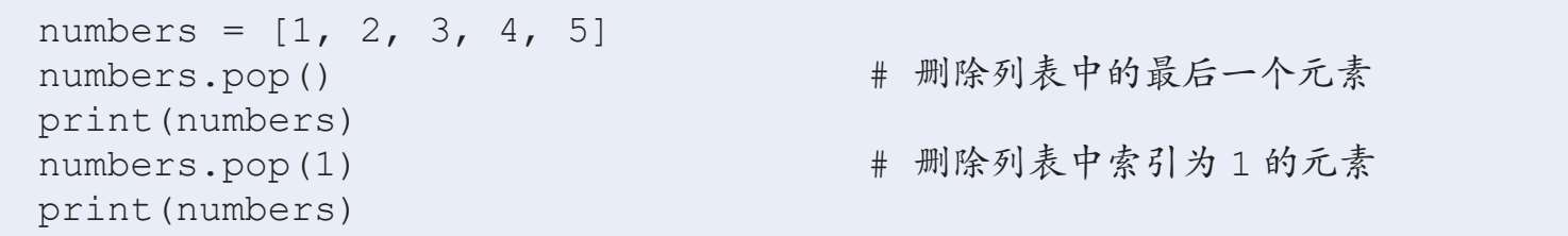 pop()方法用于删除列表中的某个元素,如果不指定具体元素,则删除列表中的最后一个元素。示例代码如下: