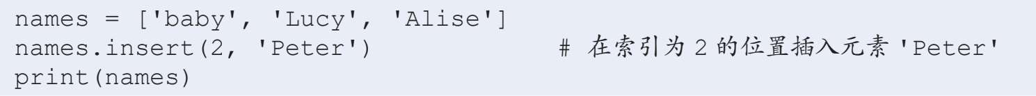 insert()方法用于将元素插入列表的指定位置,插入后该位置及其后面的元素整体会向后移动。示例代码如下: