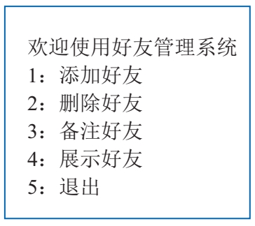 如今的社交软件层出不穷,虽然功能千变万化,但都具有好友管理系统的基本功能,包括添加好友、删除好友、备注好友、展示好友等。下面是一个简单的好友管理系统的功能菜单,如图4-1 所示。