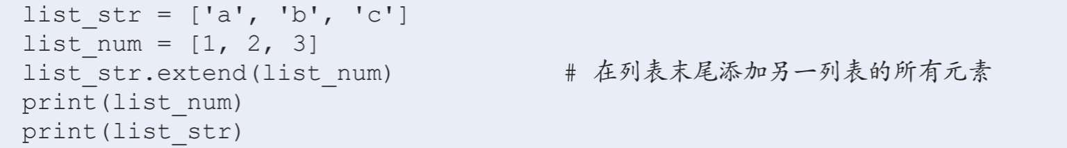 extend()方法用于在列表末尾一次性添加另一个列表中的所有元素,即使用新列表扩展原来的列表。示例代码如下: