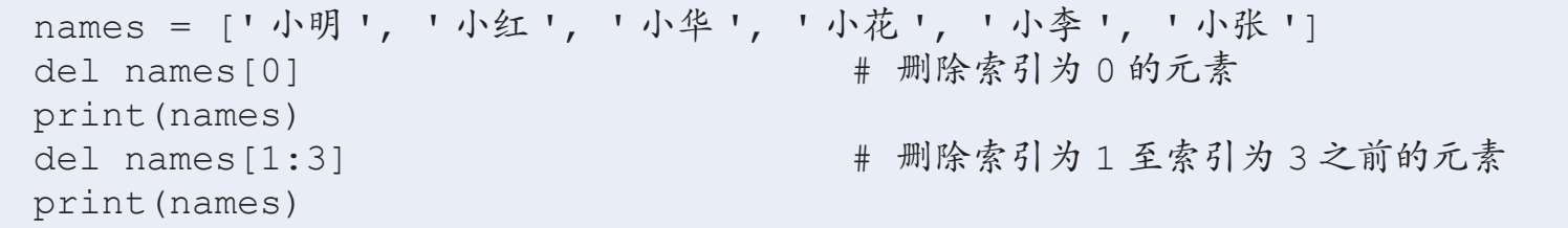 del语句可以删除列表中单个或多个元素。示例代码如下: