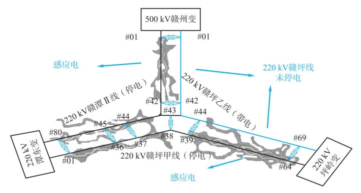 图1-32 同塔并架的带电赣坪乙线使赣潭Ⅱ线和赣坪甲线产生感应电示意